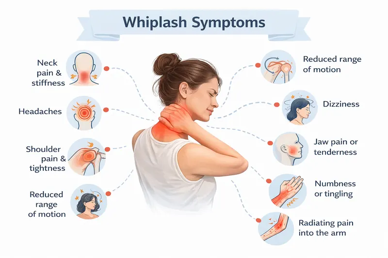 MedlinePlus notes that delayed whiplash symptoms can include dizziness, headache, and pain or stiffness in the neck, jaw, shoulders, or arms.