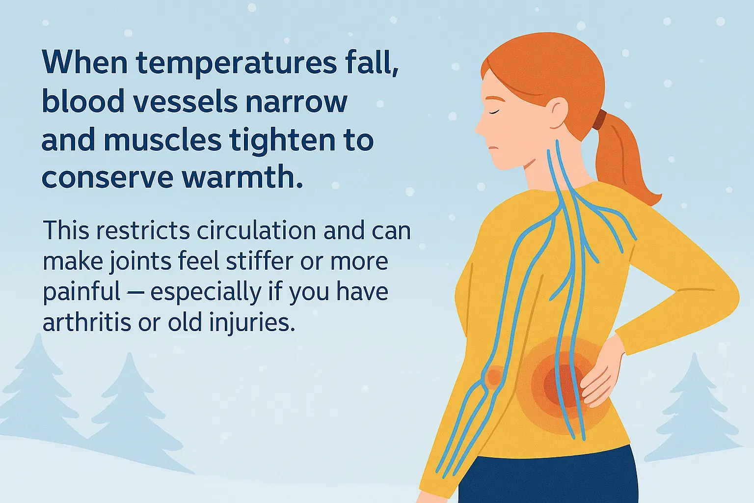 When temperatures fall, blood vessels narrow and muscles tighten to conserve warmth. This restricts circulation and can make joints feel stiffer or more painful — especially if you have arthritis or old injuries.