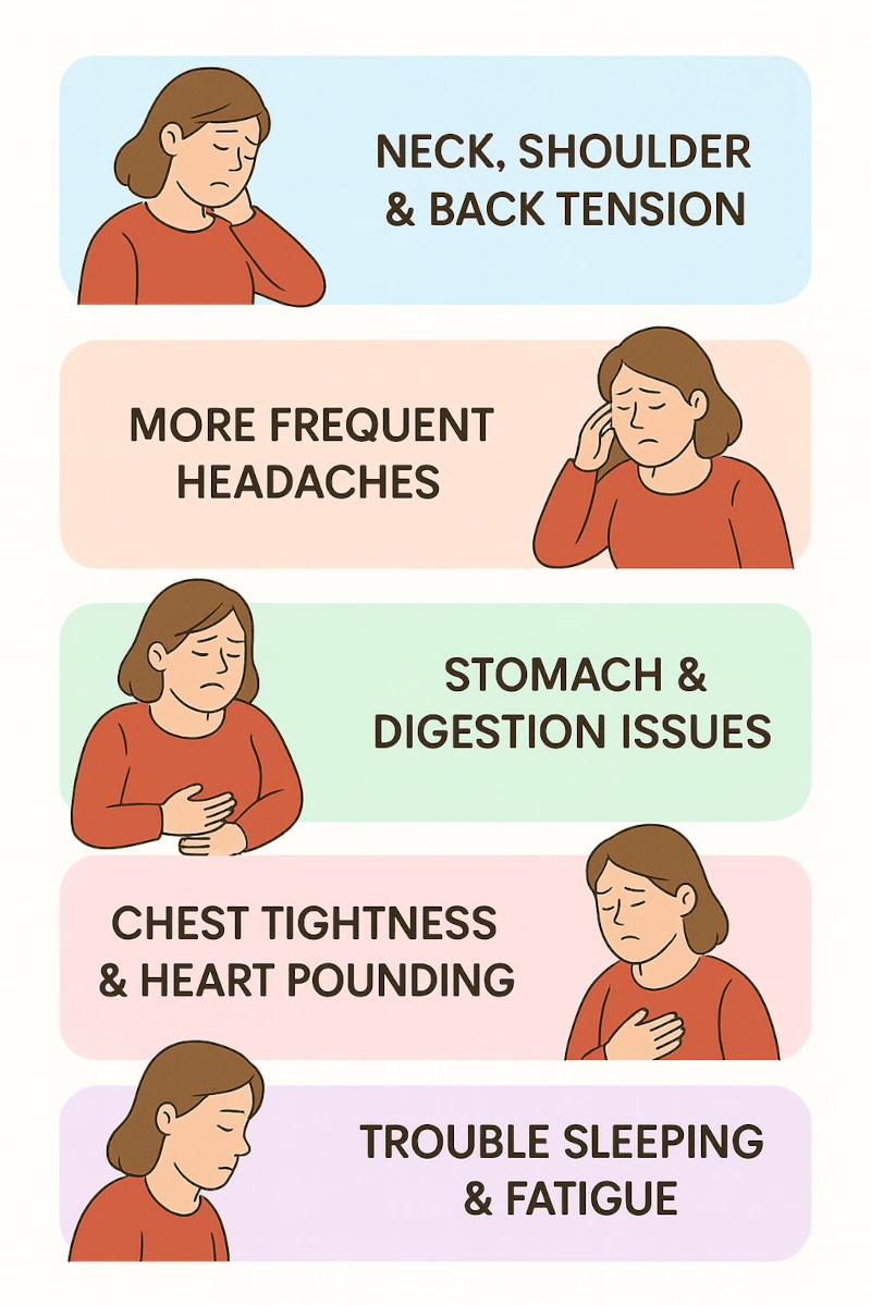 Chronic stress isn’t just a mood issue. Mayo Clinic explains that ongoing stress can contribute to: headaches, muscle tension and pain, digestive problems, sleep issues, weight changes, and higher risk of heart disease and high blood pressure. Mayo Clinic+1